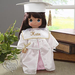 Precious Moments Graduation Doll- Brunette: Commemorate your princess on very special day with precious moments personalized graduation doll. Graduate's name will be delicately embroidered across the front of gown in metallic gold thread. You can choose either blonde or brunette hair color. A doll stand is also available. Doll is dressed in a beautiful, white satin graduation cap and gown with collar and tassle accented in metallic gold trim. You can get this gift for $42.95.Make your holiday shopping experience memorable by using Personalization Mall Coupons.