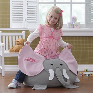 Ellie Elephant Personalized Bean Bag Chair: Gift this cute bean bag to your little ones. They will love it. Ellie elephant bean bag chair is custom embroidered with any name you choose in bright pink. It is constructed soft, but durable fleece fabric. The 3-D elephant design cover is removable and it is machine washable. Measurement of chair is approx. 20" in diameter x 12"H. Bean bag chair is filled with lightweight polystyrene beads. Your Price for this item is $59.95.