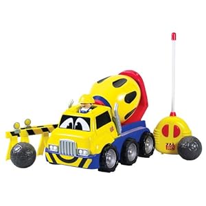 Kid Galaxy My First Radio-Controlled Cement Truck: It features a removable driver with a vehicle face that is even friendlier. It comes with 2 construction horses and 3 boulders. It includes an easy 2-button remote. It requires batteries (which are Sold Separately), 9 volt battery, 3 AA batteries. Get this toy for $25.99.